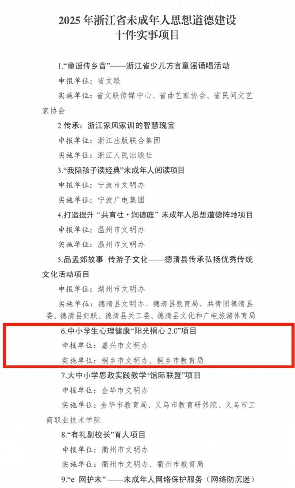 近日,浙江省精神文明建设办公室公布了2025年浙江省未成年人思想道德建设十件实事项目名单,由桐乡市文明办、桐乡市教育局实施的中小学生心理健康“阳光桐心2.0”项目成功入选。