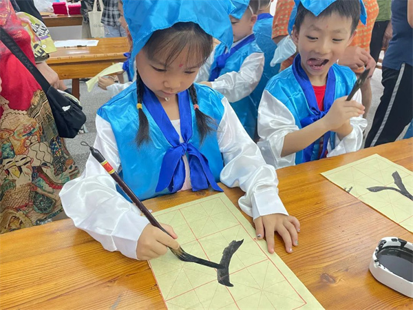 经过“正衣冠”“行拜师礼”“朱砂启智”“指聪点名”“开笔破蒙”“学童诵读”、分发“智慧笔”和“聪明蛋”等七个步骤后,孩子们顺利完成了开蒙仪式。