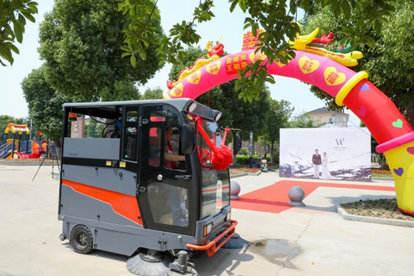 伴随着一阵发动机的启动声,一辆簇新的垃圾清扫车在南庄村的新村点内开始了它一天的工作。车前大大的红绸和喜字引来了居民们的关注和讨论,原来这辆清扫车正是村里参与节俭办酒的小夫妻用节省下来的办酒费用购买并捐赠的。