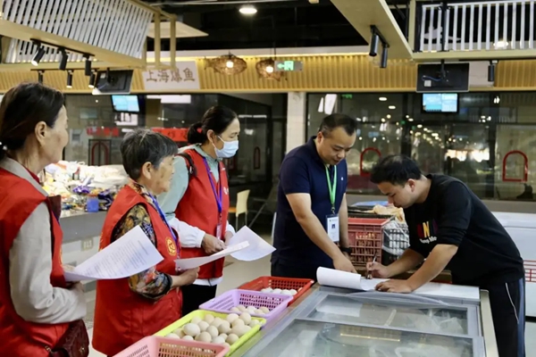 活动现场,“堰妈妈”菜篮监督团随机抽取摊位查看菜品,利用农贸市场的公平秤对需要称重的菜品重新过秤?!把呗杪琛辈死杭喽酵懦稍彼锉嫠呒钦撸约旱娜粘9ぷ骶褪羌觳椴似返男孪识?,以及各市场经营户是否存在缺斤少两的问题,以此督促商户诚信经营,强化诚信经营的良好风气。