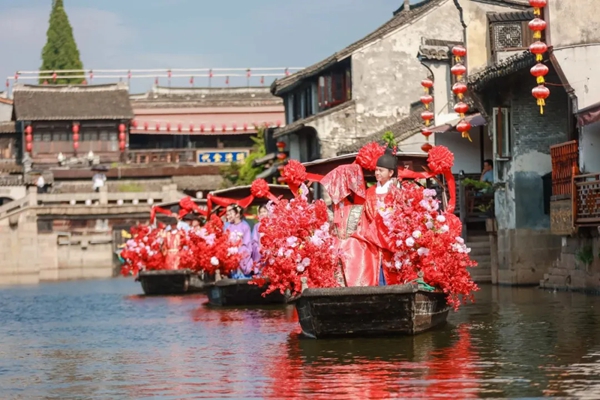在每年定期举行“水上集体婚礼”现场,新人乘着婚船在西塘古镇里的胥塘河上徐徐而行,大衫霞帔,披红挂彩,向两岸的居民和游客分享幸福与美满,用实际行动引导群众树立正确的家庭观、婚姻观、价值观。