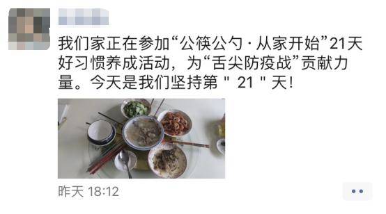 “我们家正在参加‘公筷公勺·从家开始’21天好习惯养成活动,为‘舌尖防疫战’贡献力量。今天是我们坚持的第21天!”4月27日下午,自梧桐街道凤凰社区浅水湾小区的“公筷公勺”小区公约制定以来,诞生了第一批坚持使用公筷公勺,完成21天打卡活动的家庭,他们也即将获得社区赠送的健康礼物。