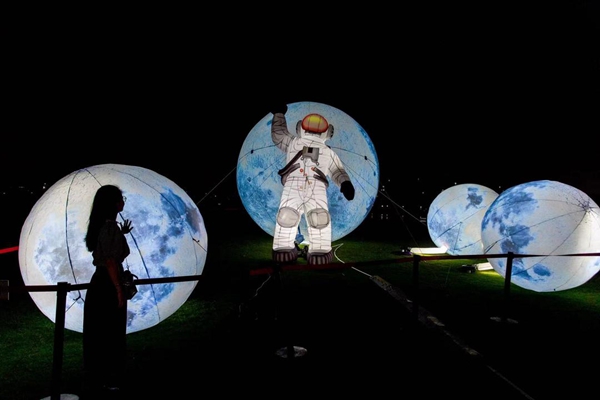 此外,超级月亮、宇航员、月兔……百米星光长廊也来到公园内,游客在灯光秀中就能“打卡”整个宇宙。