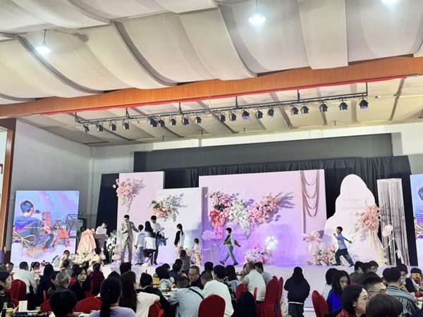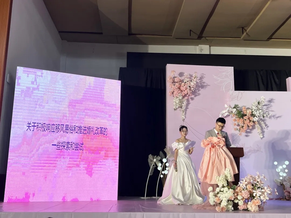 身后的LED大屏上,粉色的背景板简单的写着两行字——关于积极响应移风易俗和推进婚礼改革的一些探索和尝试。