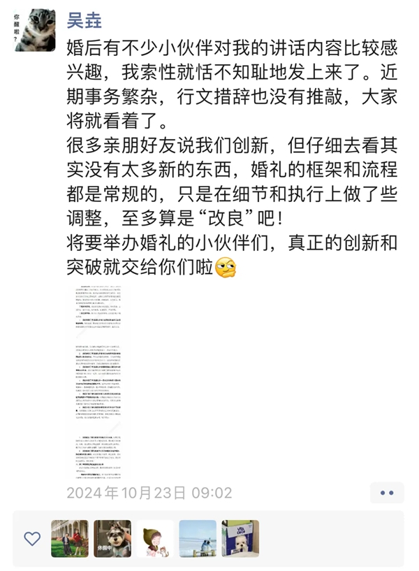 婚礼结束后,很多年轻人找到吴垚向他“取经”,希望能在自己的婚礼上“复刻”,也有亲朋好友夸他的婚礼很有新意。对此,吴垚表示自己的婚礼框架和流程都是常规的,只在细节和执行上做了调整,顶多算“改良”。他希望自己的经验总结,能给更多婚礼新人信心与鼓励,帮助他们在移风易俗改革中实现更大的创新和突破。