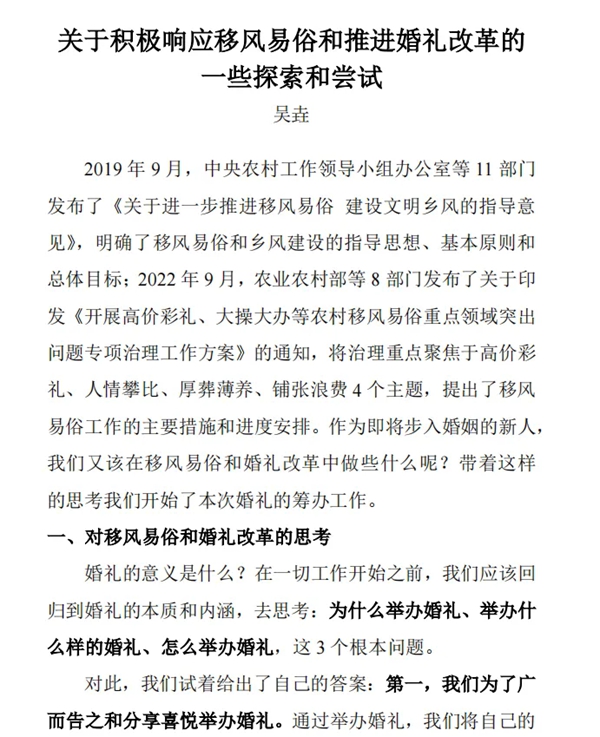 吴垚的这场婚礼,是新时代青年以实际行动从“小家”出发,积极响应移风易俗、引领婚育新风的一次生动实践,也是芝村村推进移风易俗工作的一个缩影。