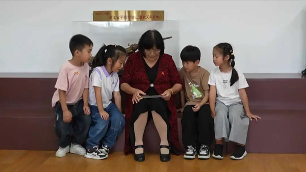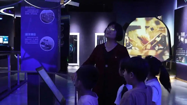 在平湖市独山港镇的中国航天科普馆里,作为义务讲解员的姚爱英,在给幼儿园的小朋友们讲解中国的航天故事。