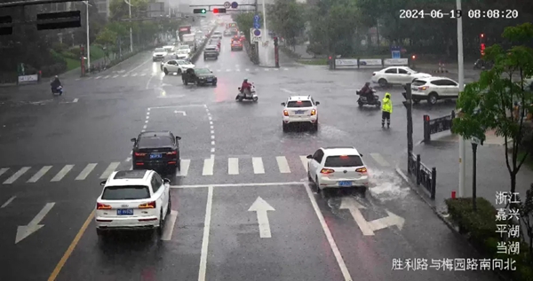 正在路口执勤的交警大队辅警屠晓华
