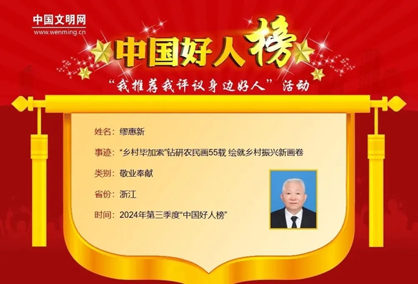 学习身边好人,激发向善力量。11月12日上午,2024年第三季度“中国好人榜”正式发布,来自嘉兴的农民画艺术家缪惠新光荣上榜,当选敬业奉献类“中国好人”。一起来看看这位“中国好人”的事迹和漫画故事。