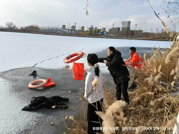 援疆教师中的两名男老师在河边奋力救援,三位女老师也没闲着,方蕾老师一边安慰落水的女孩,一边给她鼓劲;何逸菲和吴佳音赶紧打电话报警并向边上工作人员求助。沈一飞跑到近处,女孩距离岸边有一定距离。他尝试从冰面上直接走过去实施救援,当天最低温度已达零下14度,再加上连续下了多天的雪,湖边异常湿滑!