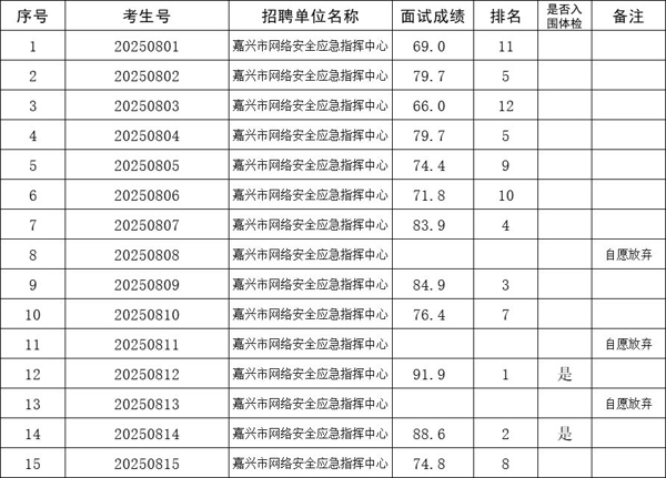 2025年8月23日,中共嘉兴市委宣传部组织对所属事业单位公开选聘入围面试人员进行面试,现将成绩公布如下。咨询电话:0573-82521799。
