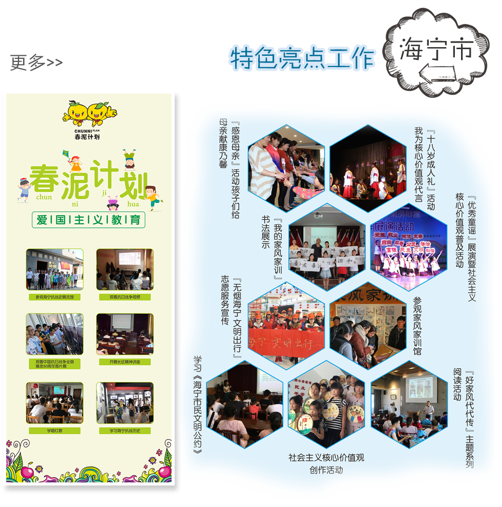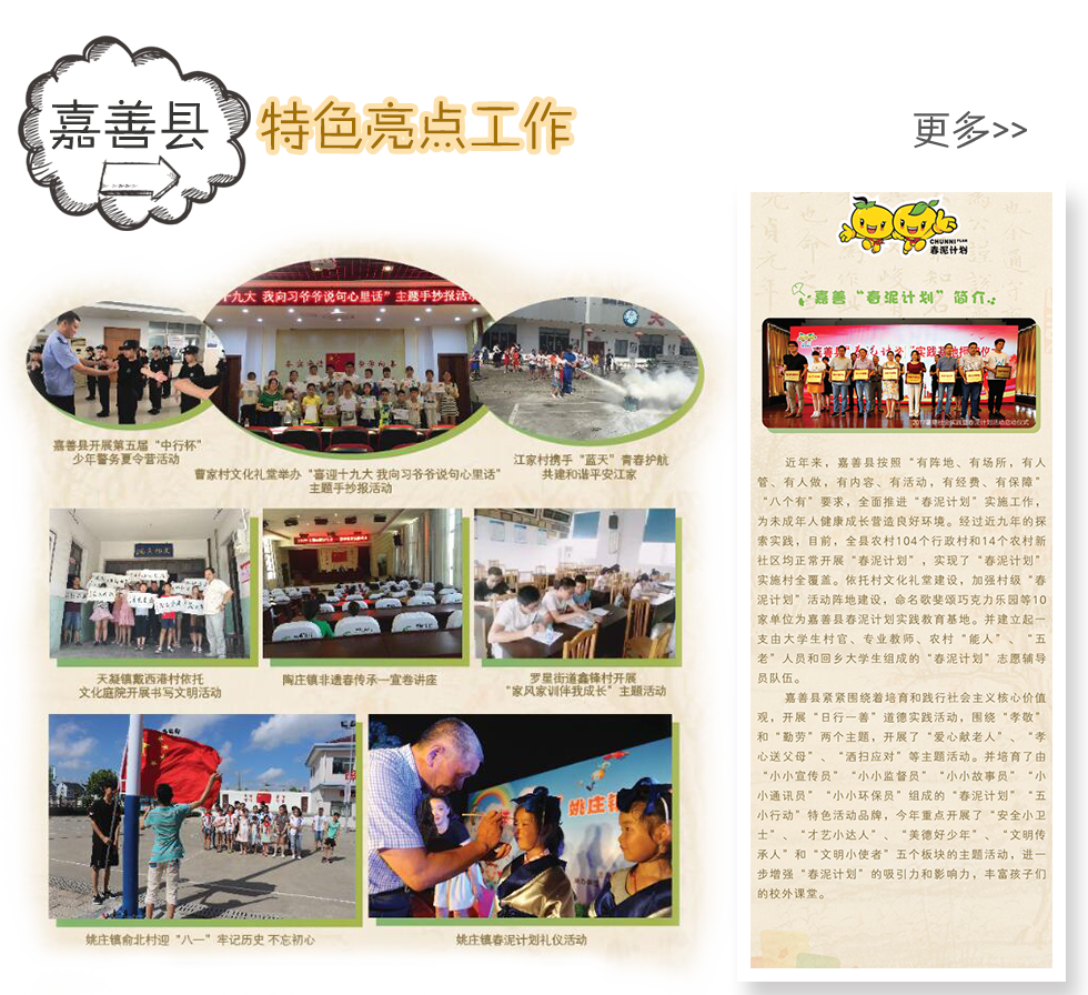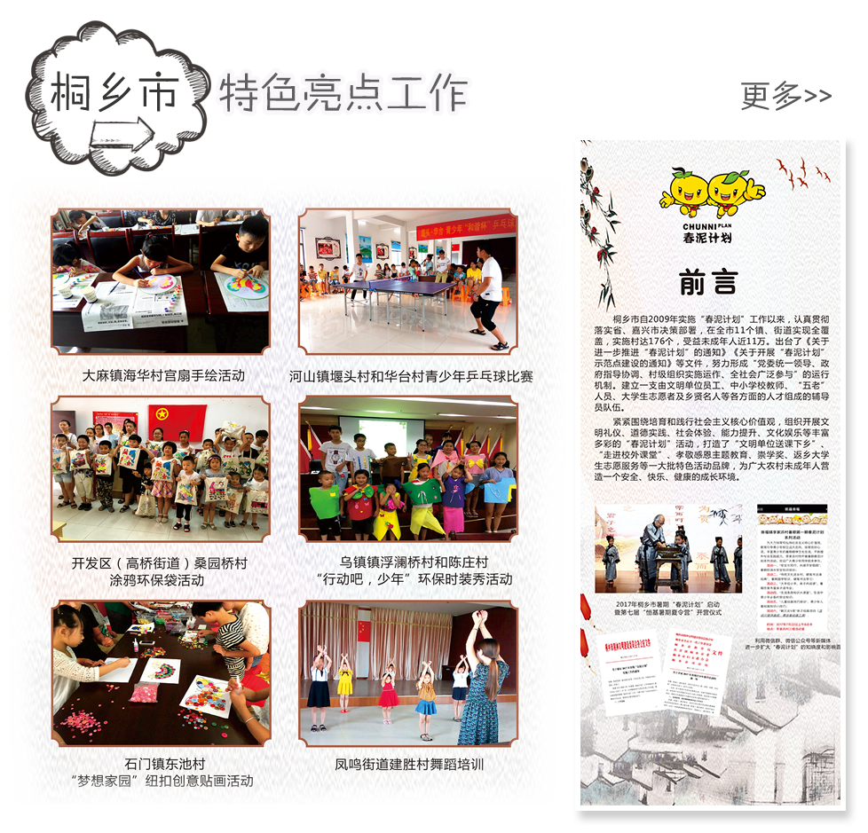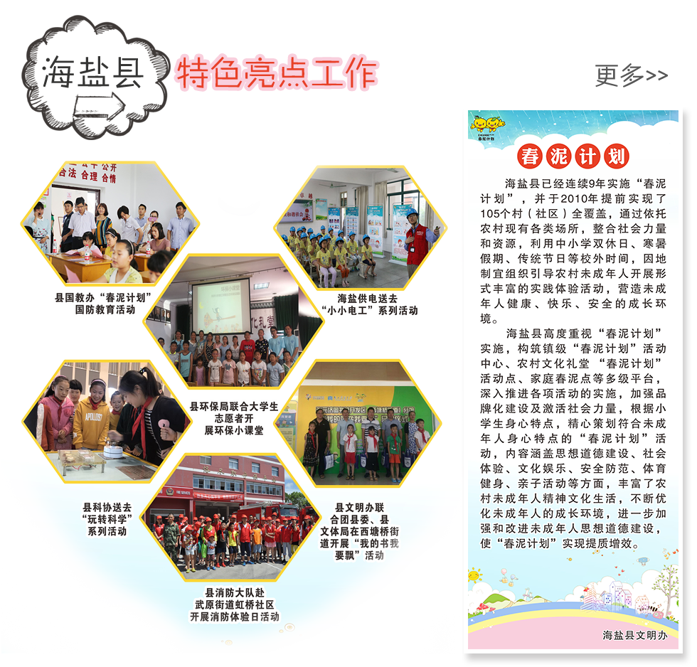 | 近年来,嘉兴市加强组织领导,创新活动载体,长效推进“春泥计划”工作,不断满足未成年人精神文化需求。各地将“春泥计划”工作纳入镇(街道)年度工作部署、考核等环节,促进各镇(街道)党委政府高度重视,推动工作落实。市区两级及时举办寒暑假“春泥计划”启动仪式,下发了相关文件,进行了工作部署。各地在普遍提高同时,加强示范村和特色项目建设,目前建成示范村40个,示范点10个。2017年,各地累计投入840.97万元,开展活动1万多次,参与文化专管人数943人、外聘教师2010人、志愿者15559人、未成年人5.9万人次。 |