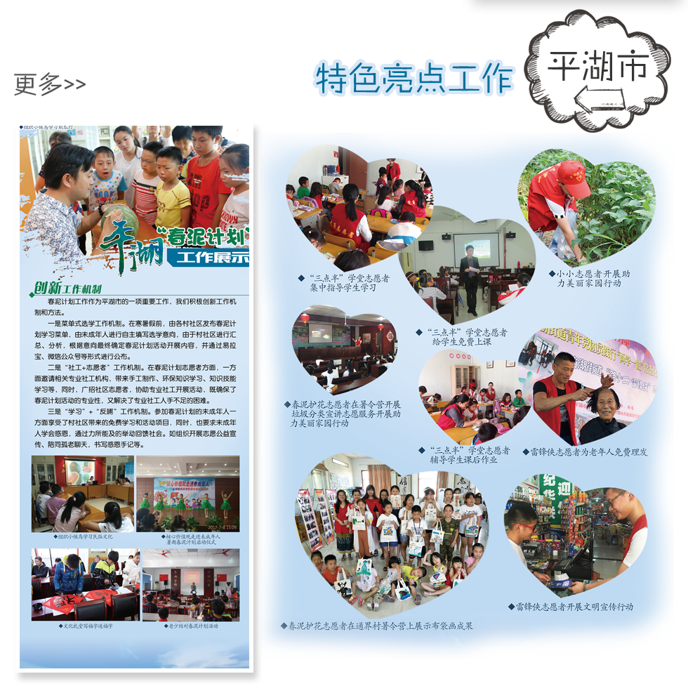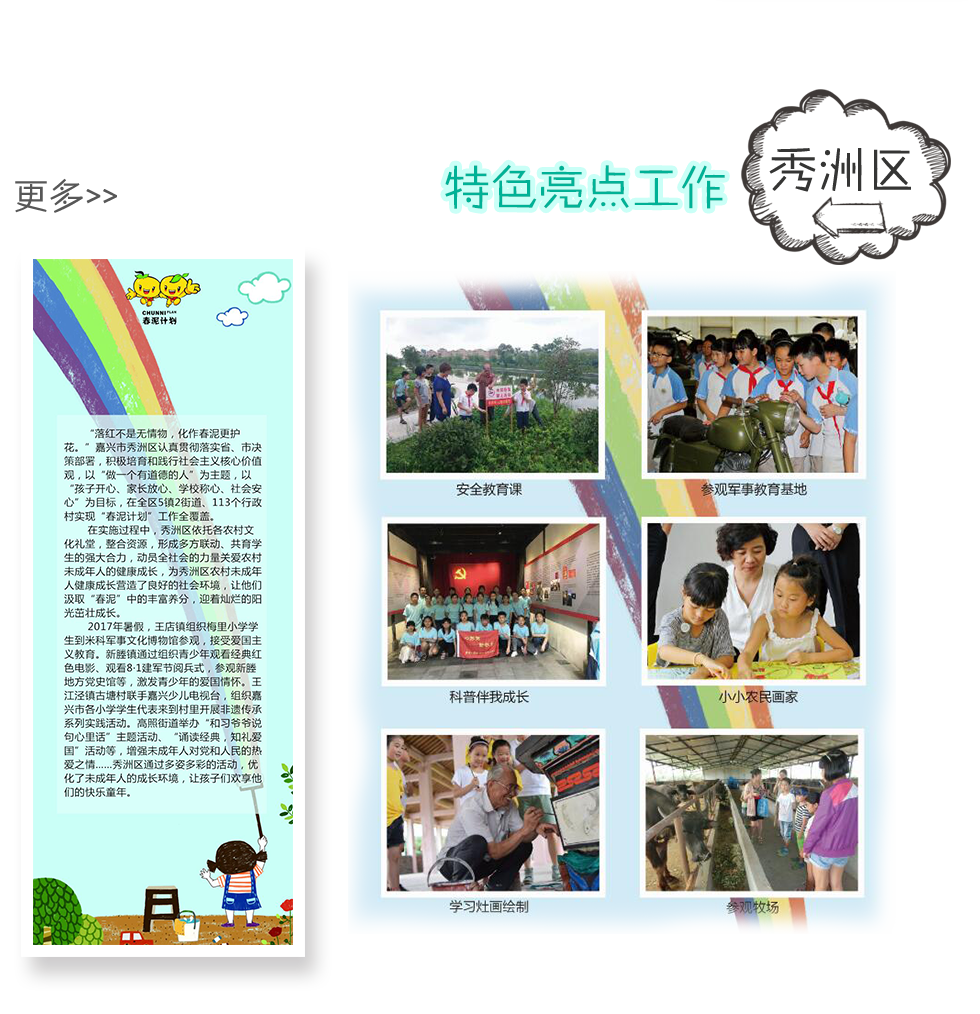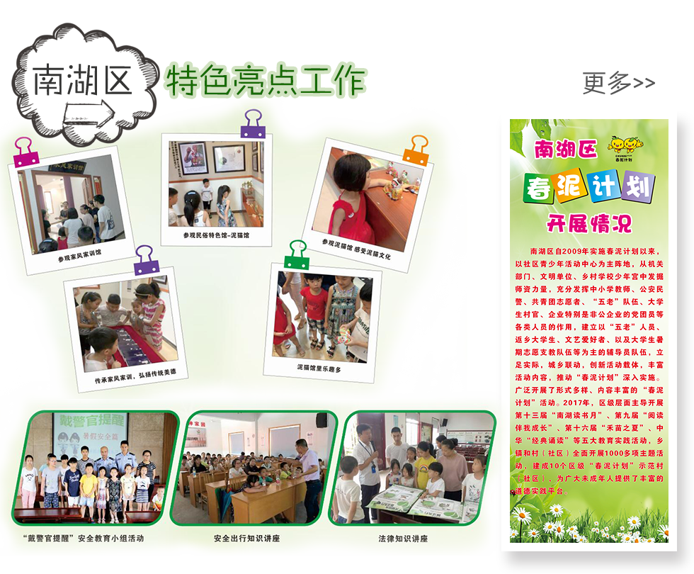 | 近年来,嘉兴市加强组织领导,创新活动载体,长效推进“春泥计划”工作,不断满足未成年人精神文化需求。各地将“春泥计划”工作纳入镇(街道)年度工作部署、考核等环节,促进各镇(街道)党委政府高度重视,推动工作落实。市区两级及时举办寒暑假“春泥计划”启动仪式,下发了相关文件,进行了工作部署。各地在普遍提高同时,加强示范村和特色项目建设,目前建成示范村40个,示范点10个。2017年,各地累计投入840.97万元,开展活动1万多次,参与文化专管人数943人、外聘教师2010人、志愿者15559人、未成年人5.9万人次。 |