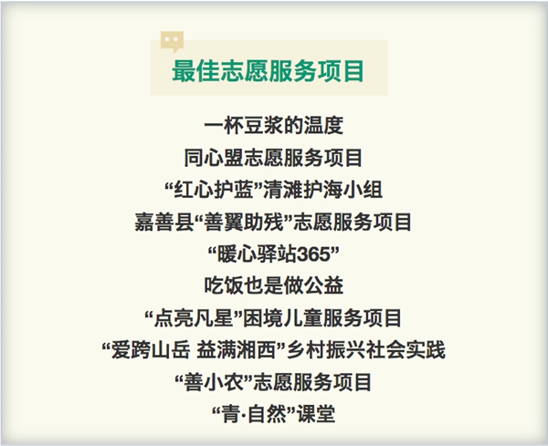 活动共表彰了三大最美(最佳)先进典型,分别为全市最美志愿者10人、最佳志愿服务组织10组、最佳志愿服务项目10个。