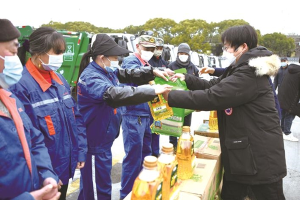1月5日,在嘉兴大桥垃圾中转站,爱心企业为环卫工人们送来了油、米等年货,感谢他们为美丽城市作出的贡献。(南湖晚报 记者 王振宇 通讯员 金虹 摄)